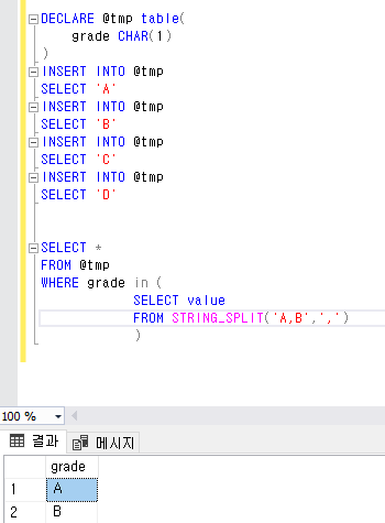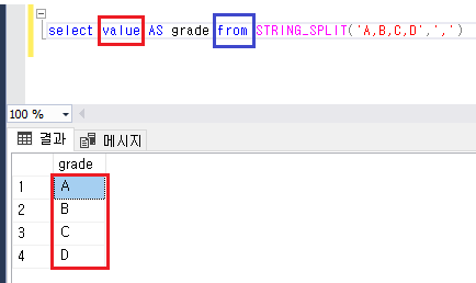 SELECT value FROM STRING_SPLIT('A,B,C,D',',')