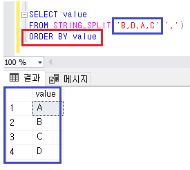 FROM STRING_SPLIT('B,D,A,C',',')