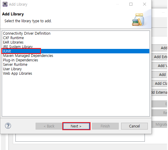 2. 라이브러리 리스트 중 Junit 선택 > Next