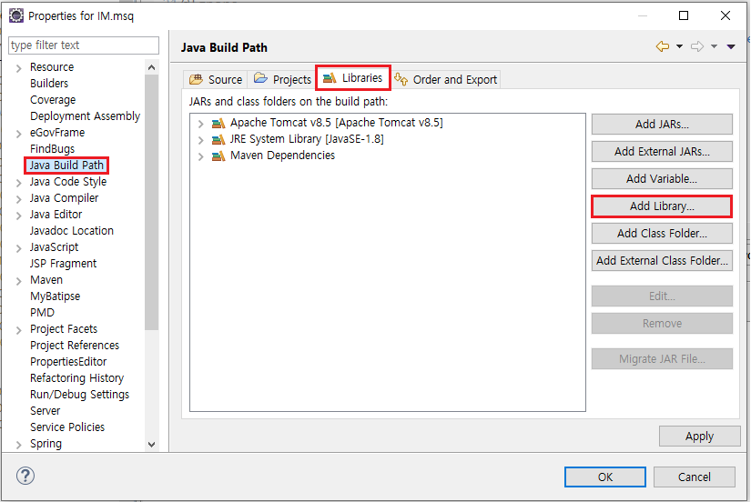 1. 프로젝트 우클릭 -> Properties -> Java Build Path -> Libraries -> Add Library