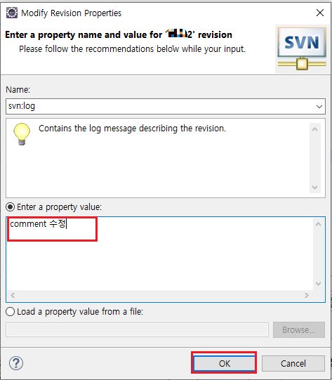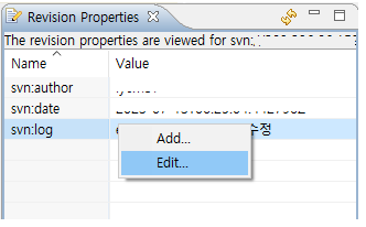 3. 새롭게 열리는 Revision Properties 화면에서 svn:log 부분 오른쪽 클릭 > Edit