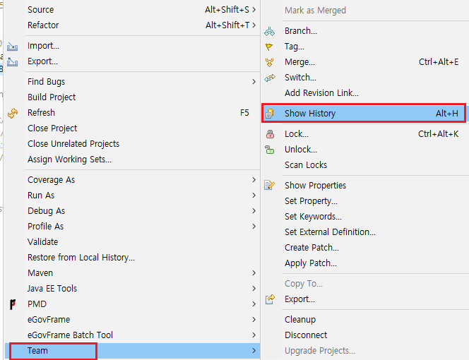 1. 프로젝트 오른쪽 클릭 > tean > Show History