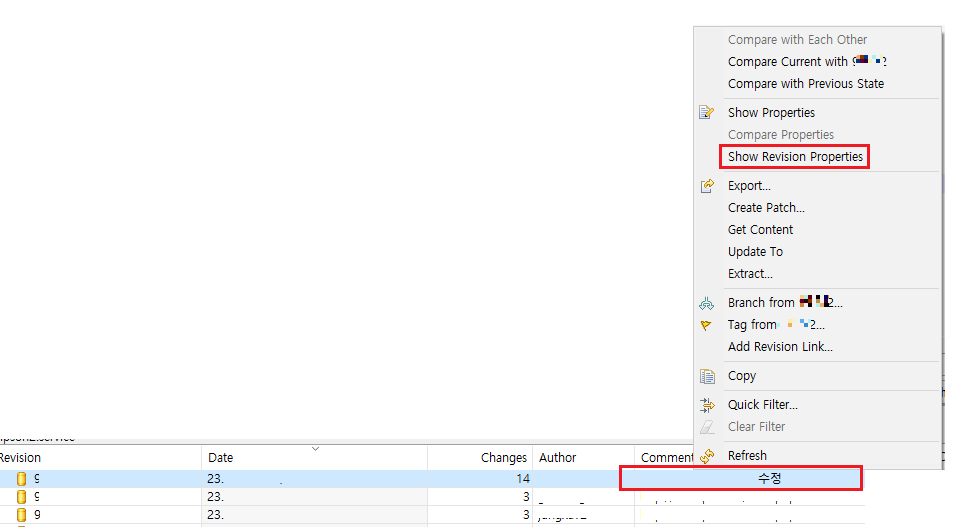 2. 수정할 Comment 있는 row 오른쪽 클릭 > Show Revision Properties