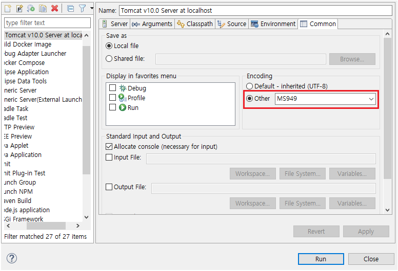 2. Tomcat > Common > Other 칸에서 UTF-8 선택 후 Run