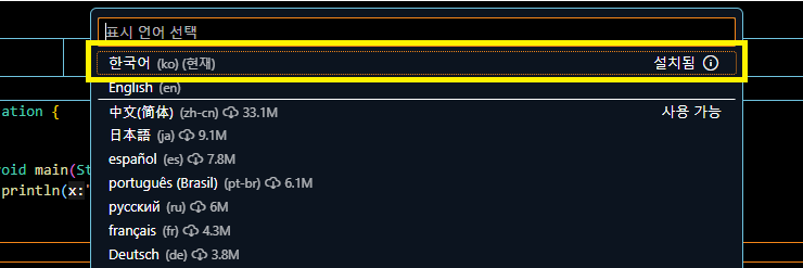 맨 윗 상단 클릭 후 >Configure Display language 또는 [Ctrl] + [Shift] + [P] 누른 후 Configure Display language입력
