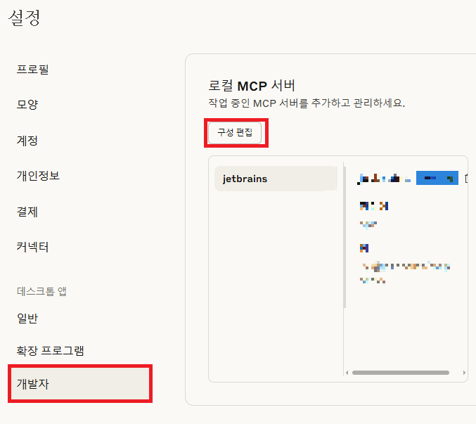 4. Claude 재시작 후 3번의 개발자 설정에 Jetbrains가 뜨면 연결완료!